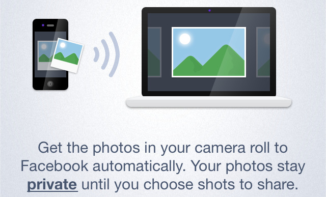 It does exactly what the name suggests – automatically uploads your captured photos to a private album on Facebook. You can share them with your friends later if you want.