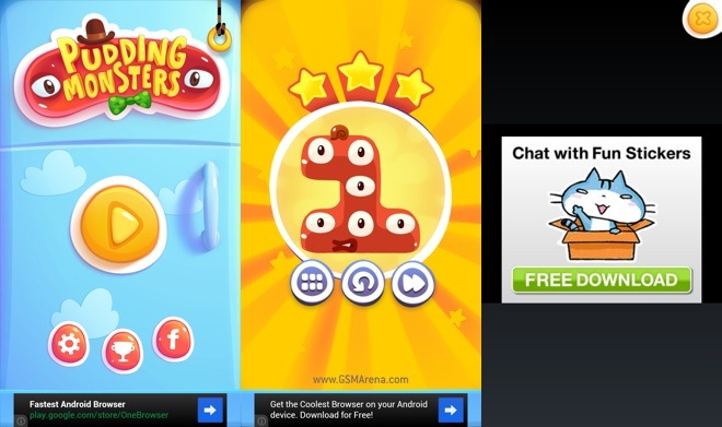 On Android, there are two versions again. The standard one is free but with ads and the HD version is paid, which other than the lack of ads, is similar to the standard version. Now ads in a free game are not that big a deal but the developers of Pudding Monsters have gone the extra mile to make them absolutely frustrating, so you end up buying the paid version out of annoyance. Not only do you get ads at the bottom of the screen during the menus (which are fine), the game pauses between levels to show you a fullscreen ad, that you have to manually dismiss every time.